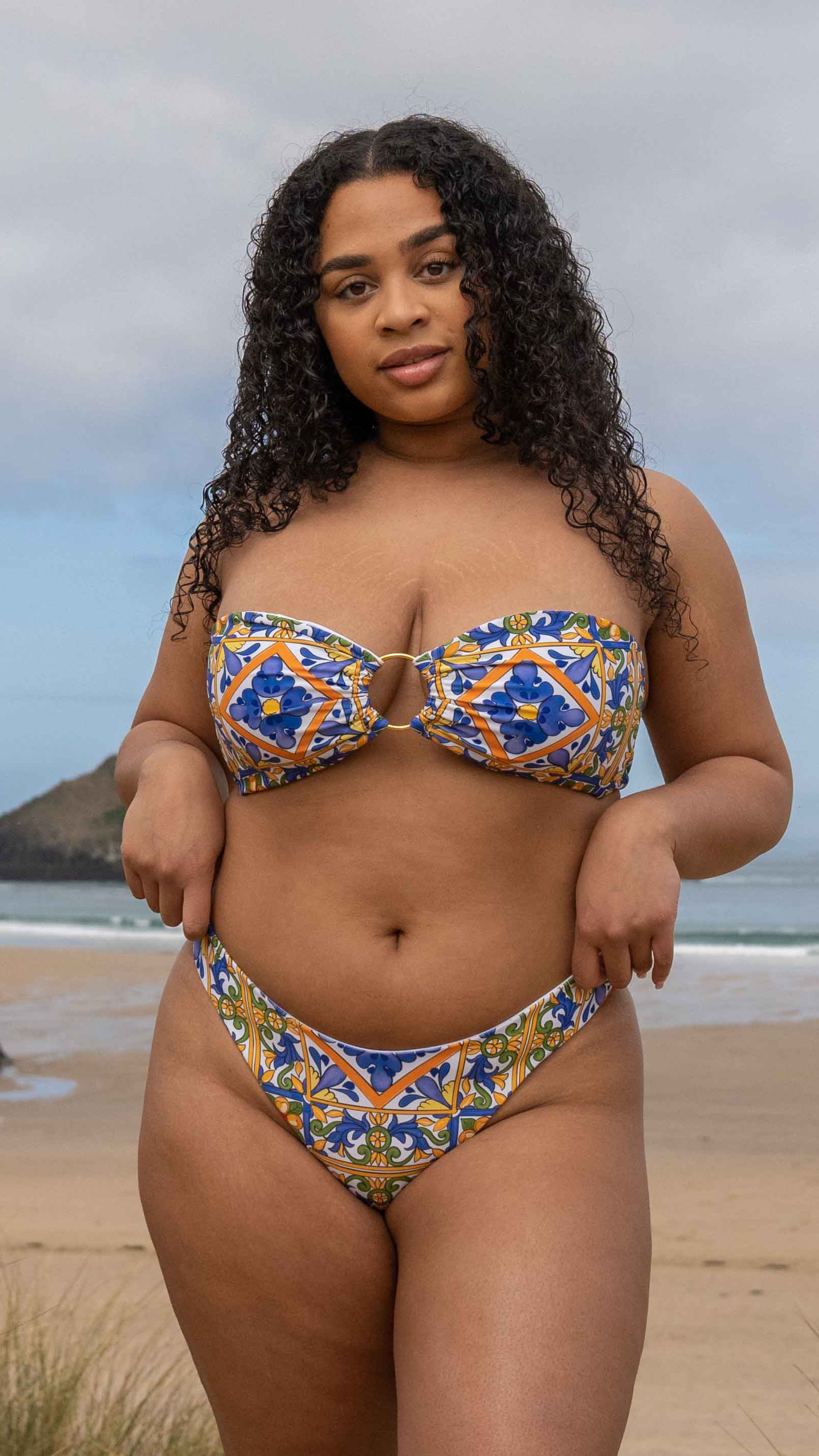 The Majolica Bikini Top is designed and handmade by Ashlea in the UK, featuring a clean bandeau silhouette with a decorative Majolica-inspired print. Designed with a gold ring connecting the bust panels and structured side seam boning, this style offers a secure, sculpted fit with adjustable back ties. Fully lined with a double layered finish for comfort and support.
