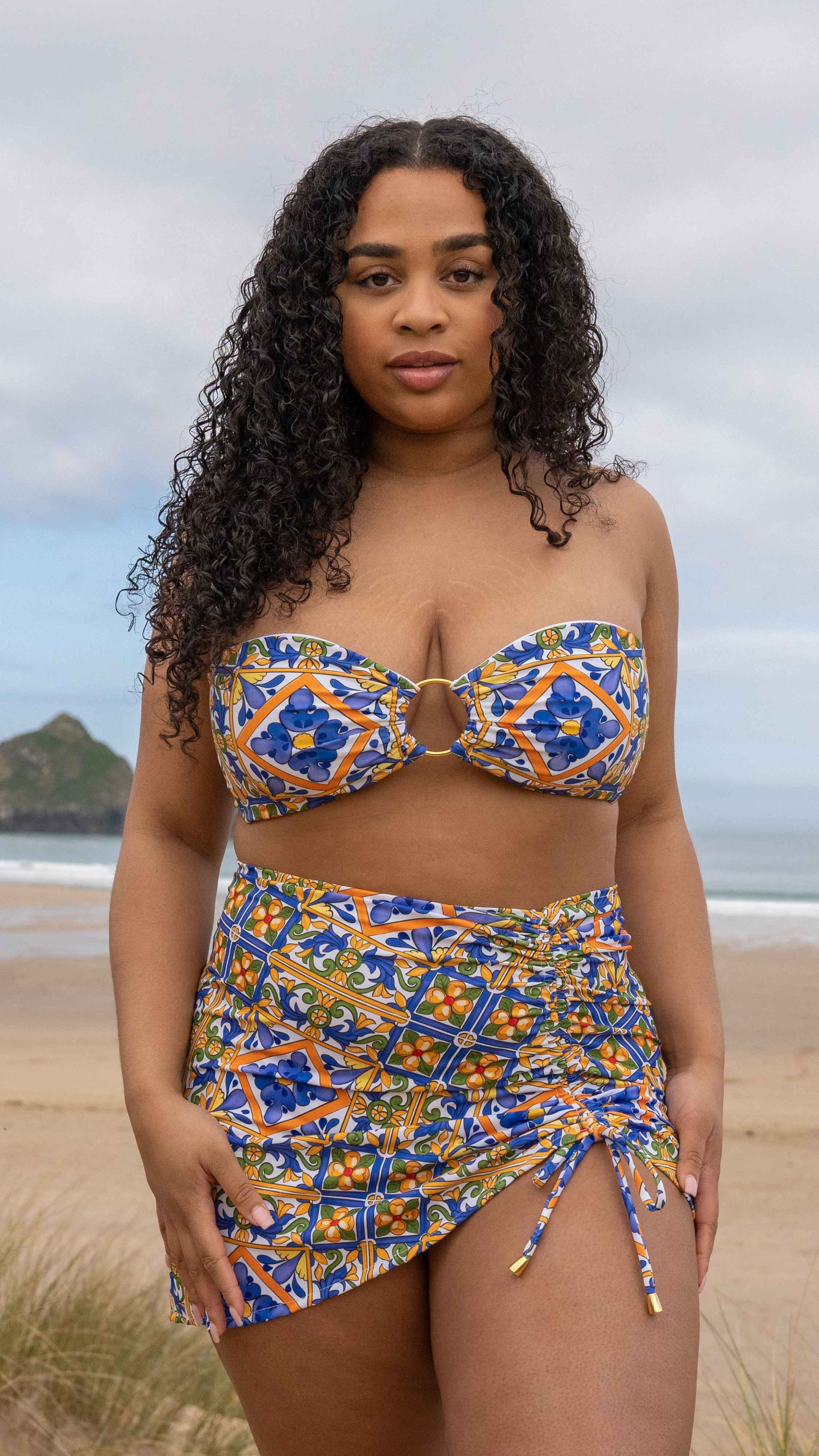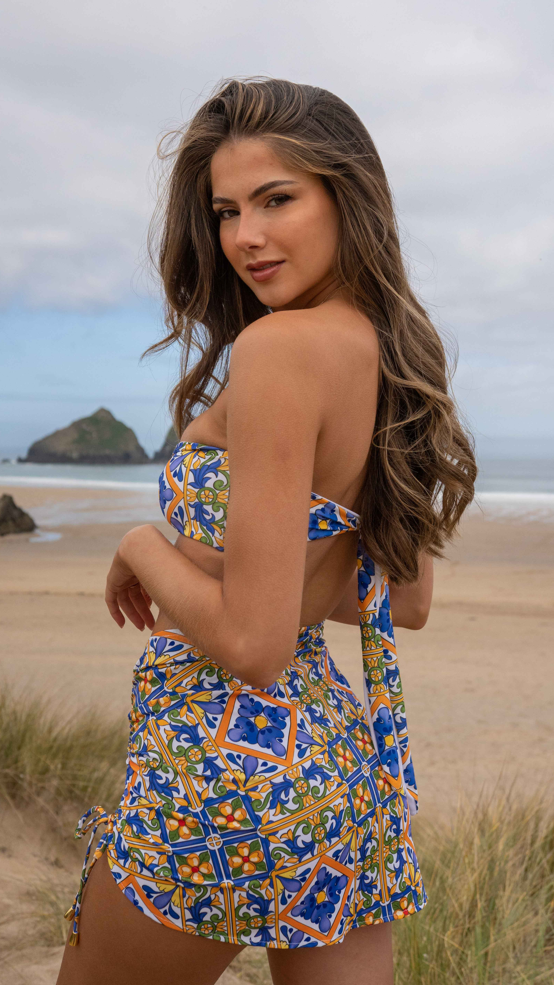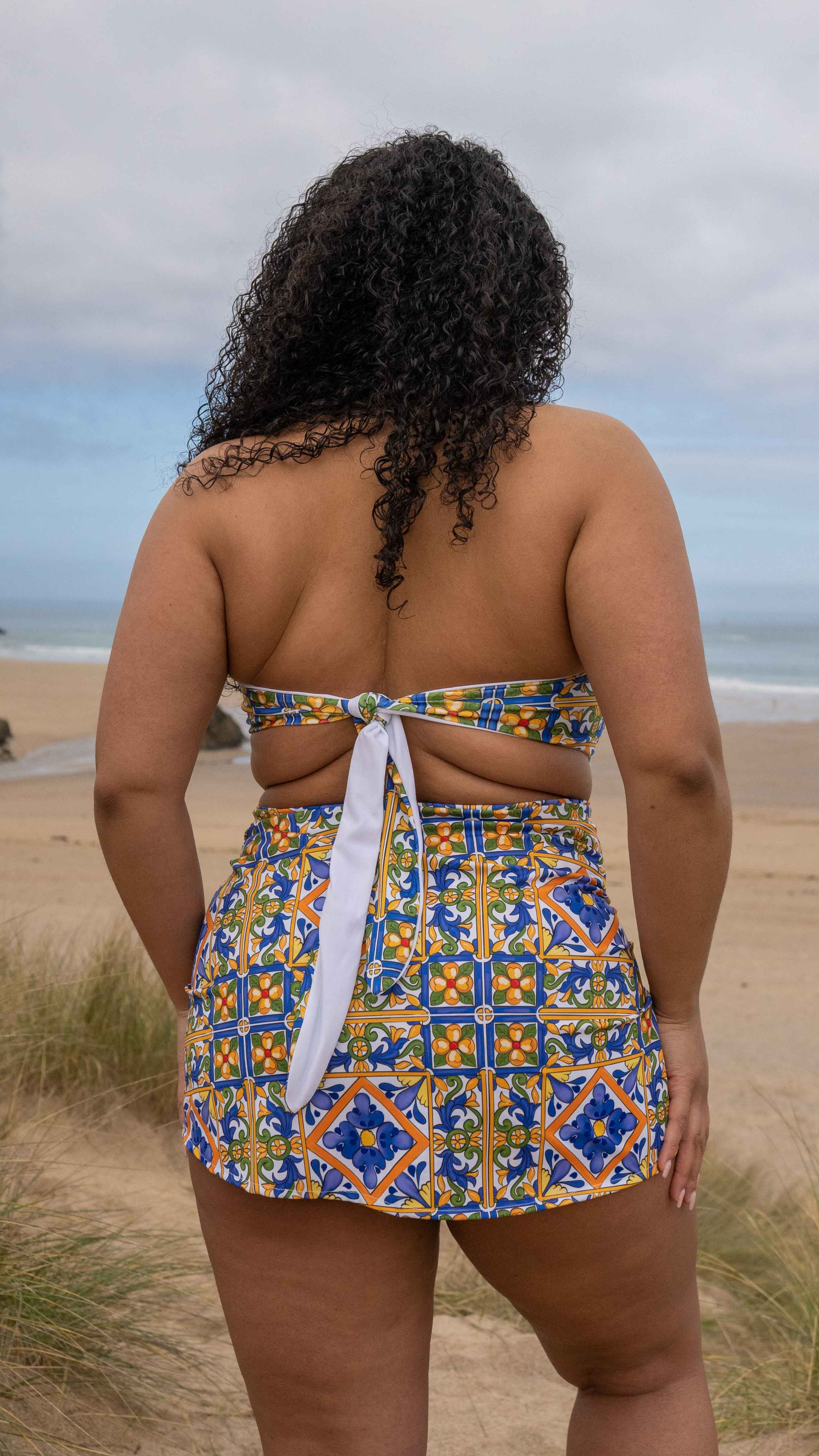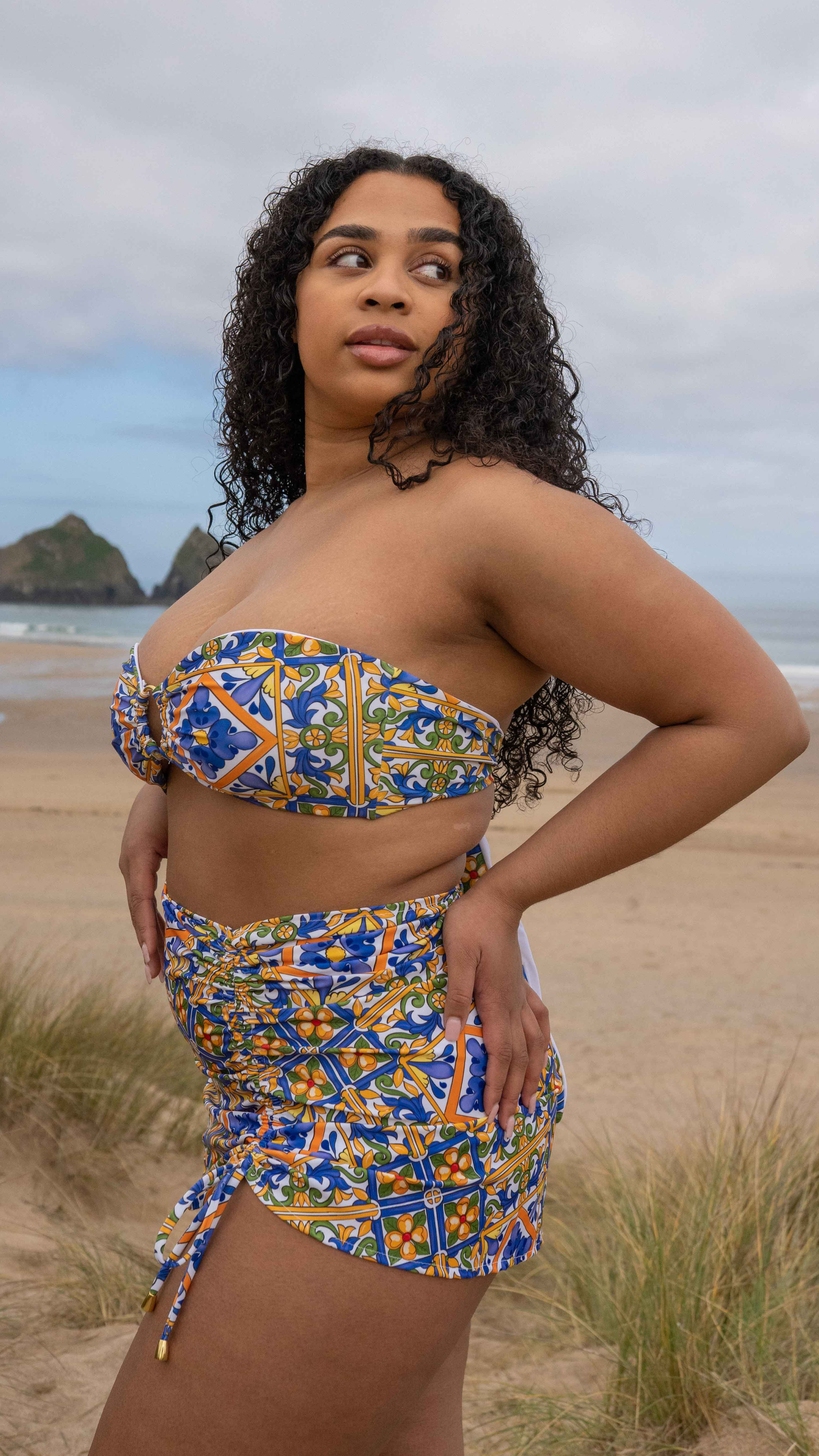 The Majolica Drawstring Cover-Up is designed and handmade by Ashlea in the UK, created to complement the Majolica swimwear set. Designed as a slip-on mini skirt, this style features elasticated drawstrings for flexible coverage and a relaxed fit. Finished with gold end detailing on the ties for a considered finish.